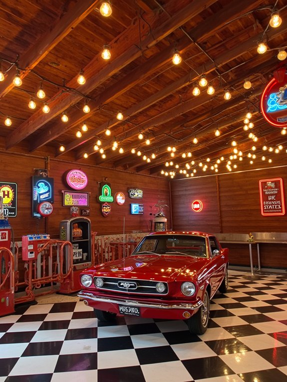 The layout incorporates essential elements like LED spotlighting, climate control systems, and specialized storage solutions. Wall-mounted display cases house automotive collectibles and historical artifacts, while the workshop area provides space for restoration projects. This dual-purpose design creates an environment that celebrates automotive heritage while maintaining practicality.
