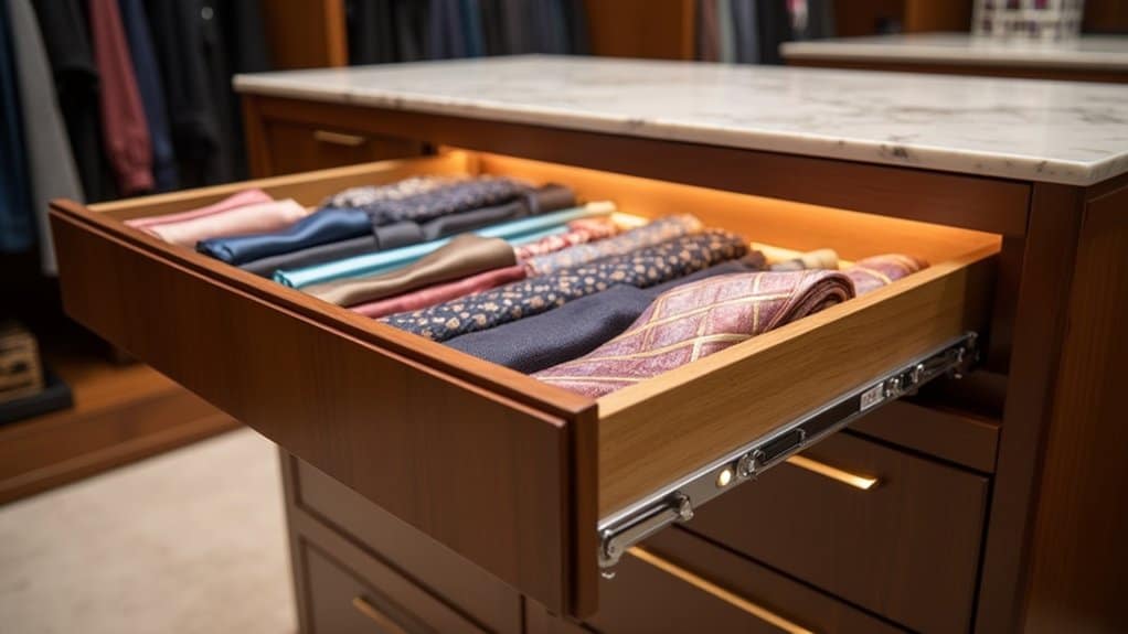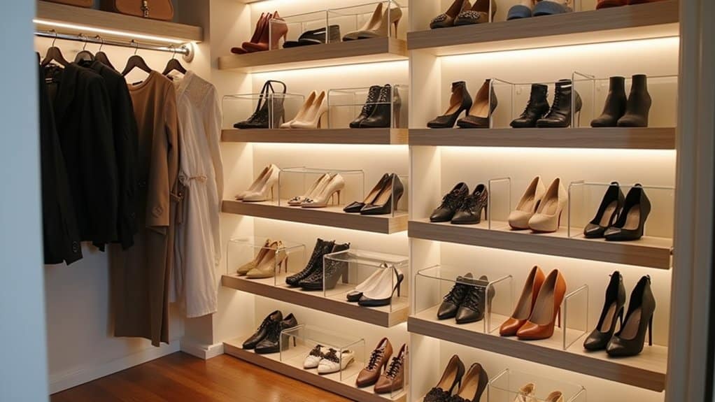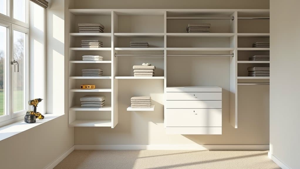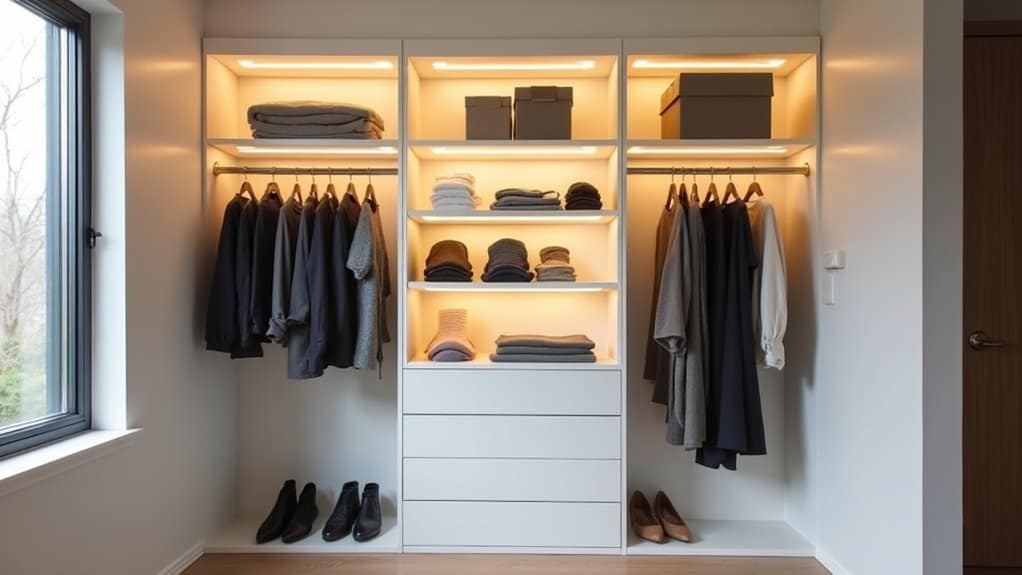 Maximizing vertical space in a walk-in wardrobe is a game-changer for storage and organization. Start by installing shelves or stacking storage units above your hanging rods to store items like seasonal clothing, bags, or boxes that aren’t frequently used. Adjustable shelving systems can adapt to your changing needs and guarantee every inch of wall space is utilized effectively.