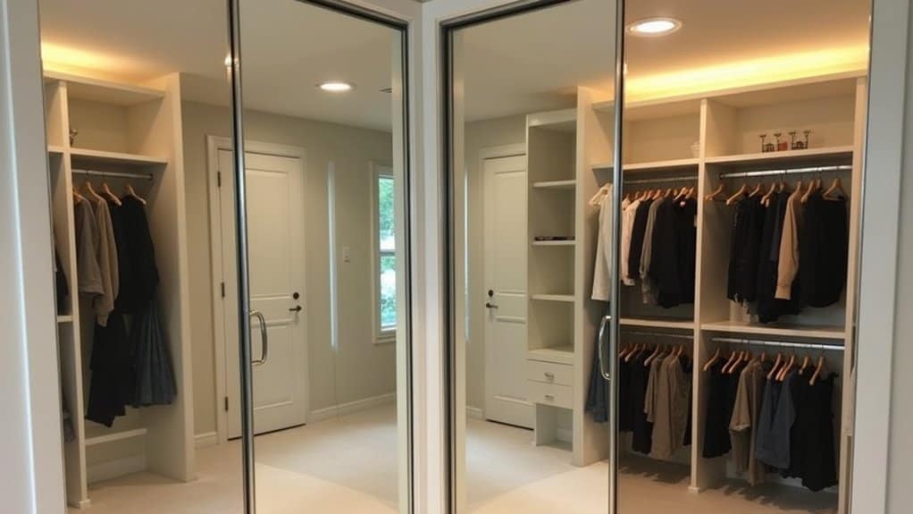 Installing mirrored doors on a walk-in wardrobe is an excellent way to enhance both functionality and aesthetics. Begin by measuring the dimensions of your wardrobe openings to guarantee you order or purchase doors that fit perfectly, accounting for any hardware or tracks needed for sliding or hinged designs. Consult with a professional or refer to manufacturer guidelines to select mirrors that are durable and securely mounted to withstand regular use.