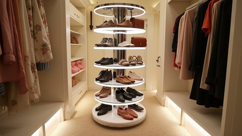 To organize with rotating carousels, categorize items by type or frequency of use, placing everyday essentials at eye level for quick retrieval. Dedicate specific sections or tiers to particular categories, such as shoes on lower levels and accessories on higher ones, to maintain order. Regularly rotate and declutter the carousel to prevent overcrowding and guarantee it remains a practical storage solution.