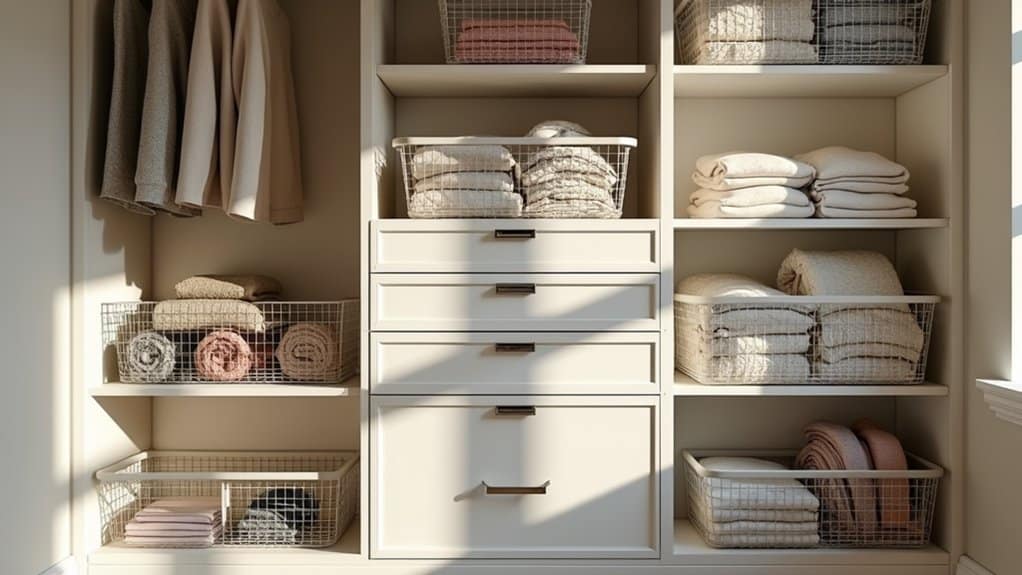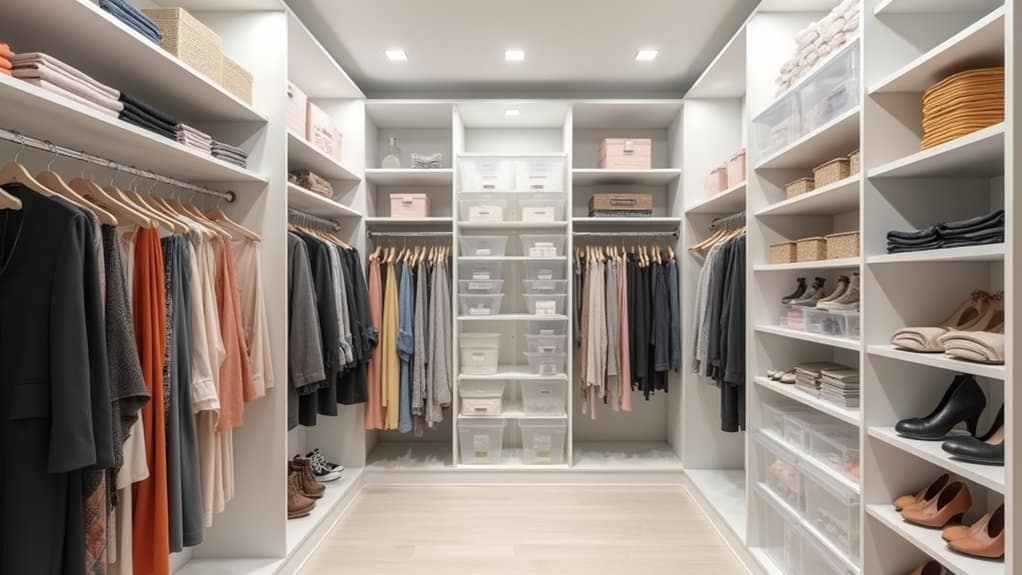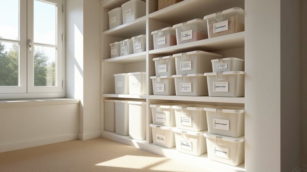 Labeling storage bins is an essential step in maintaining an organized walk-in wardrobe, as it helps you quickly identify the contents without rummaging through each container. Start by selecting a consistent labeling system, such as printed labels, handwritten tags, or chalkboard labels, to create a cohesive look. Make certain the labels are clear and specific, detailing categories like “winter scarves,” “summer hats,” or “evening clutches” to avoid confusion.