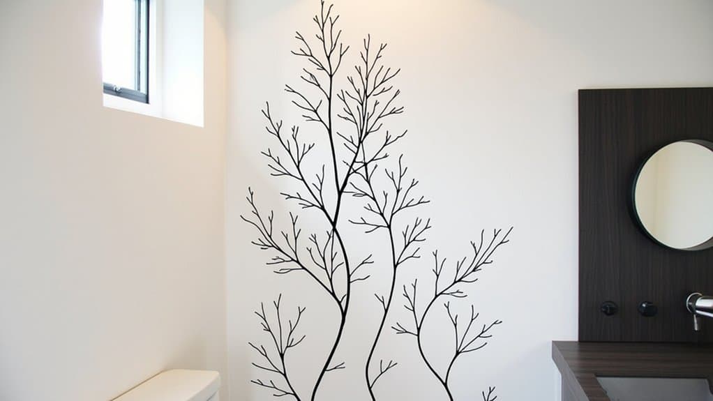 As you rethink your powder room’s vibe, consider an artistic wall decal to add a personal touch. It’s an easy, space-saving way to inject style without clutter. Pick a decal that fits your aesthetic—think floral, geometric, or abstract designs—and measure your wall first, aiming for a 24″x36″ size.