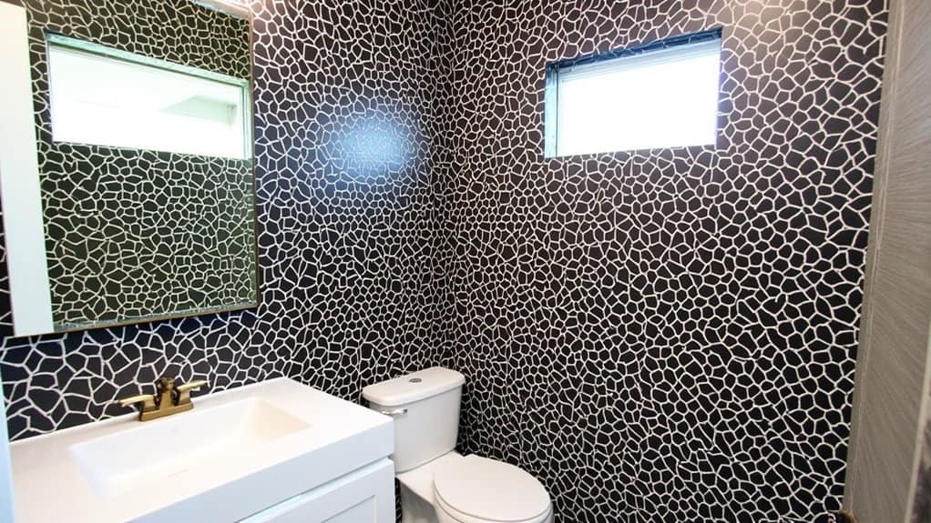 Transform your powder room with bold geometric wallpaper to create a striking focal point. You’ve got a small space, so make it pop with sharp lines and vibrant patterns. Choose a design that’s 36 inches wide for easy application on a 5×5-foot wall, and install it in under two hours.
