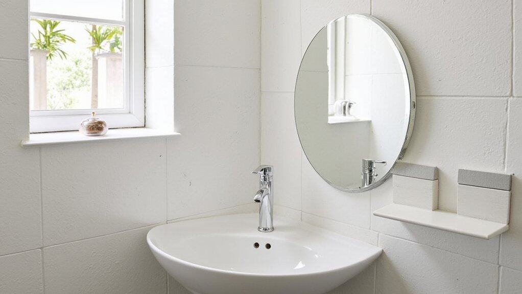 As you rethink your powder room’s design, consider adding a sleek wall-mounted mirror to amplify both style and function. It saves space and looks modern. Mount it at eye level, about 60 inches from the floor, to guarantee comfort. “A well-placed mirror can transform a cramped room,” says interior designer Jane Holt.