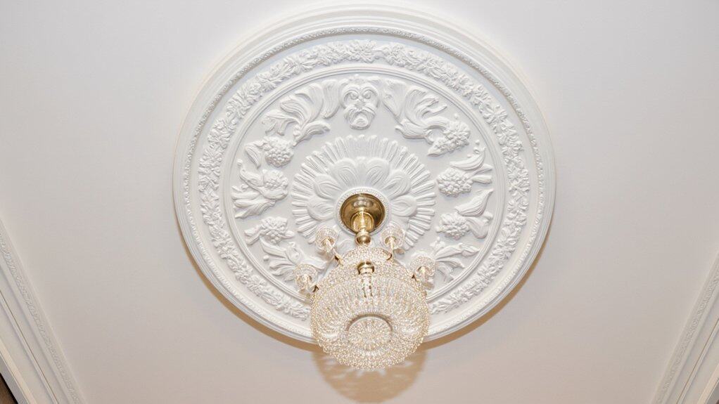 Elevating your powder room’s charm starts with a striking decorative ceiling medallion around your light fixture. This elegant touch draws the eye upward, enhancing the tiny space without clutter. Choose a medallion, about 18-24 inches in diameter, to fit a standard 5-inch fixture base.
