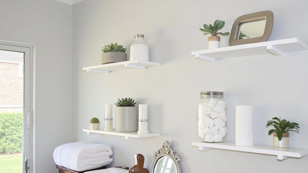 While a powder room might be small, adding floating wall shelves can transform it into a stylish and functional space. You’ve got limited room, so go vertical! Install shelves about 12 inches apart, starting 18 inches above the toilet, using a level for precision.