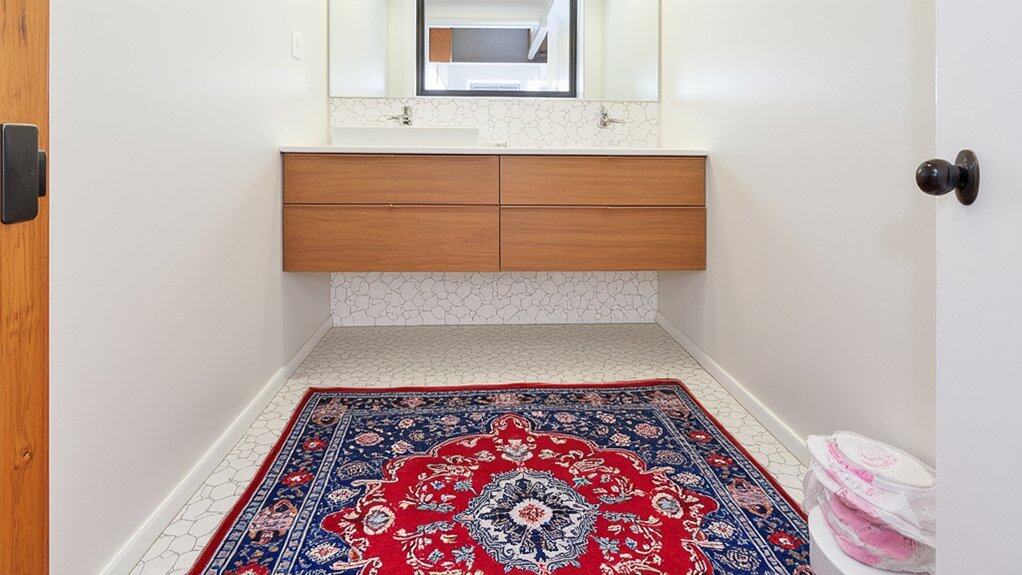 Moving from wall decals to another bold element, let’s focus on adding a colorful statement rug to your powder room. A vibrant rug can transform the space without cluttering it, but you’ve gotta choose wisely.
