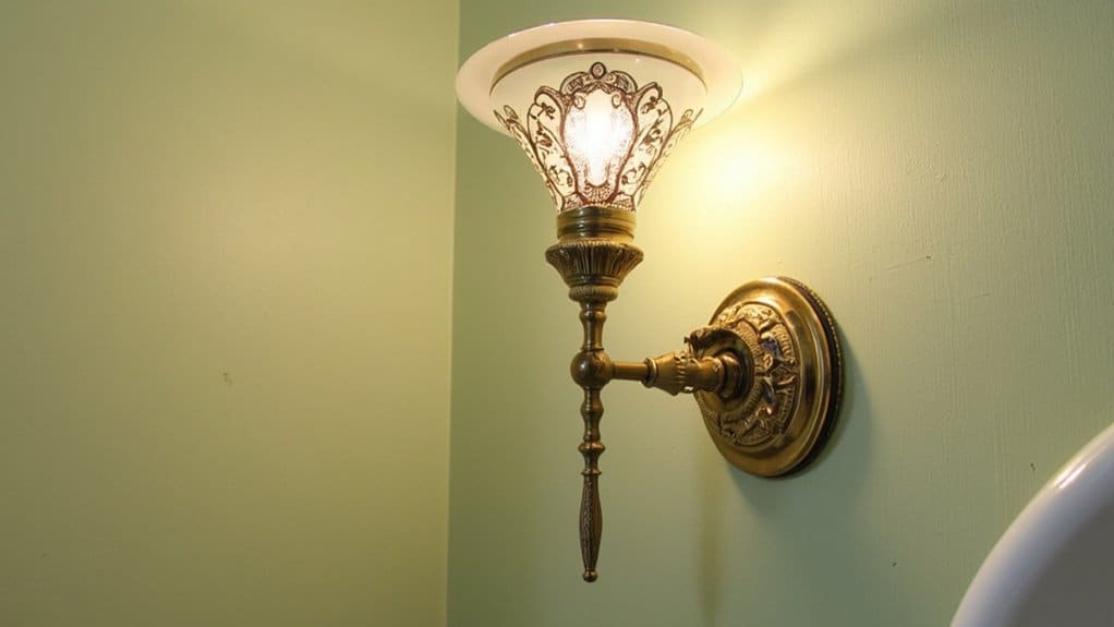 If you’re looking to add character to your powder room, consider installing a vintage wall-mounted lamp for a timeless touch. This fixture, often 10-12 inches tall, brings warmth without eating up space. Hang it 60 inches above the floor near the sink for best lighting.