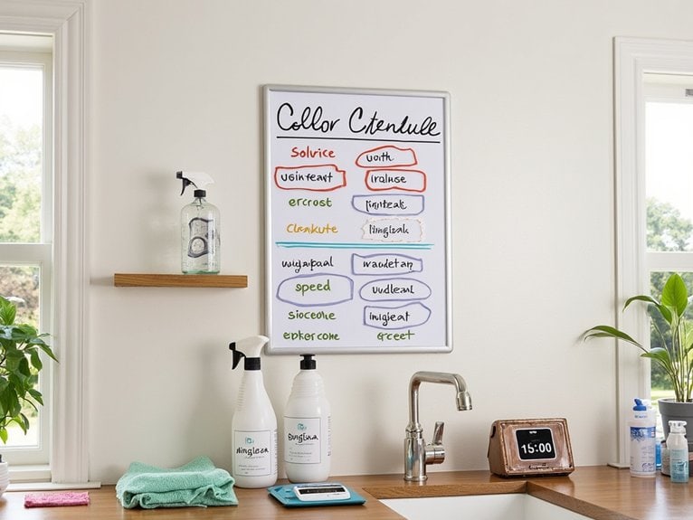 Once you’ve established your cleaning zones, making daily tasks more manageable comes down to smart scheduling and efficient routines. To maximize cleaning efficiency, tackle small tasks throughout the day rather than letting them accumulate.