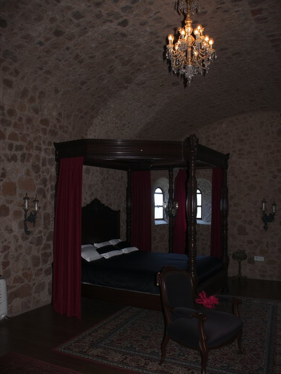 The harsh stone elements are balanced by rich velvet draperies that both soften the space visually and enhance acoustic properties. Metallic details in pewter and brass catch and reflect light sources, adding warmth and depth to the environment while maintaining the period-appropriate aesthetic.