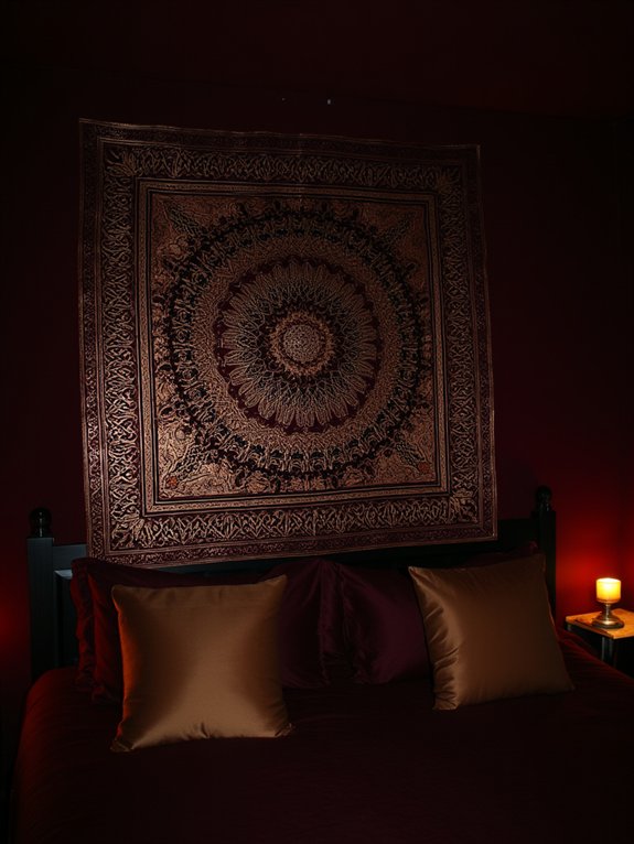 Metallic woven wall tapestries transform bedroom spaces by combining luxurious metallic threads with traditional weaving techniques. These sophisticated pieces create dramatic visual effects through the interplay of light and texture, serving as stunning focal points while adding warmth and dimension to the room’s design.