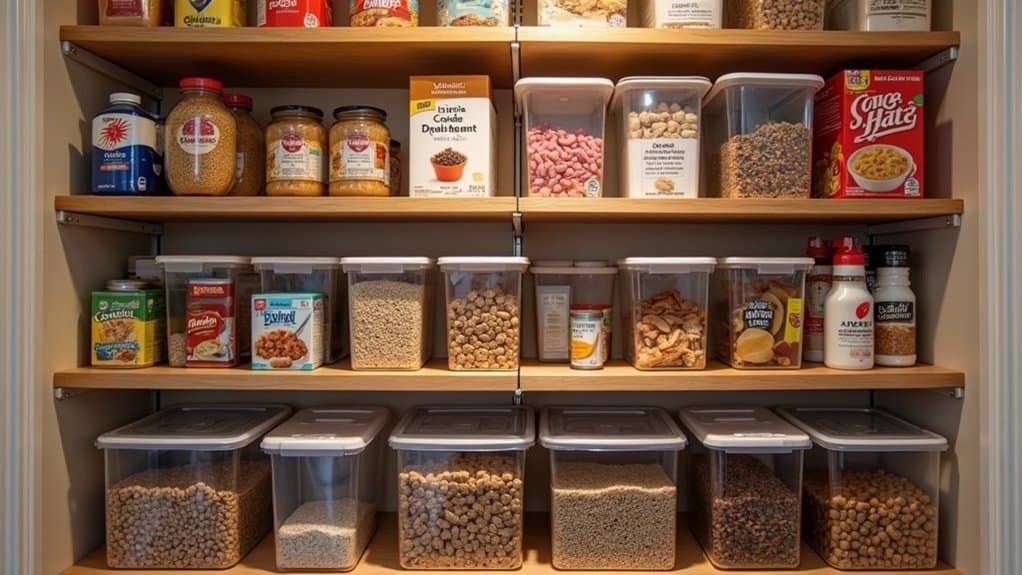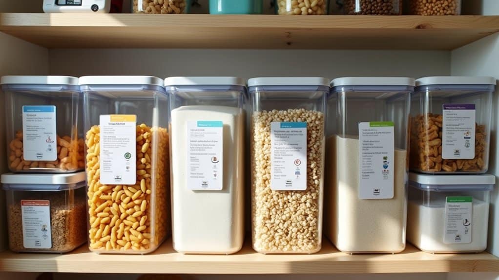 To maximize efficiency, group similar items together in these containers and arrange them on shelves based on frequency of use, with everyday essentials at eye level. Opt for stackable containers to save space and create a neat, uniform look in your pantry. Make certain to choose containers with secure lids to keep contents fresh and protected from pests. Regularly check and refill the containers as needed, maintaining the system for long-term organization and ease.