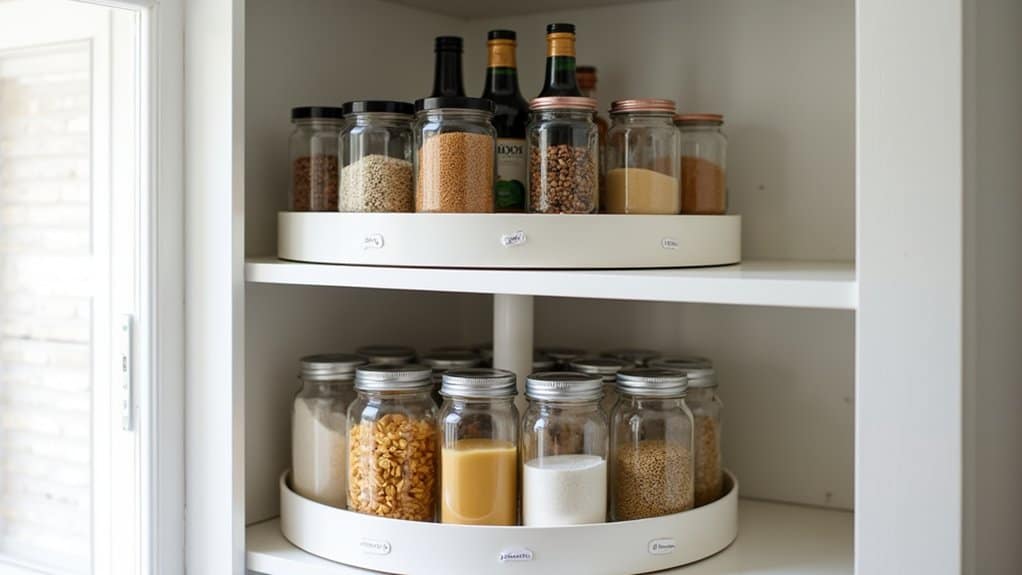 When incorporating Lazy Susans, consider using different sizes to fit various pantry areas and item types. A smaller turntable works well for spice jars, while a larger one can hold bulkier items like jars of pasta sauce or bags of rice. Make sure to leave enough space between shelves to allow smooth rotation without knocking over items. Label the edges of the Lazy Susan or use clear containers to quickly identify contents, ensuring your pantry remains both functional and tidy.