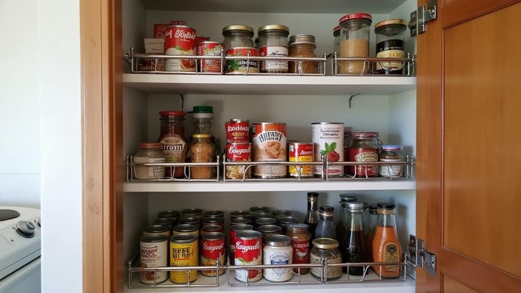 To implement this hack, place tiered organizers on shelves where you store shorter or smaller items to guarantee everything is visible and accessible. Position frequently used items like canned goods or condiments on the lower tiers for easy reach, while less-used items can go higher up. Confirm the organizers are stable by placing heavier items on the bottom and lighter ones on top to prevent tipping. This method not only doubles or triples your storage capacity but also keeps your pantry neat and easy to navigate, saving you time during meal prep.