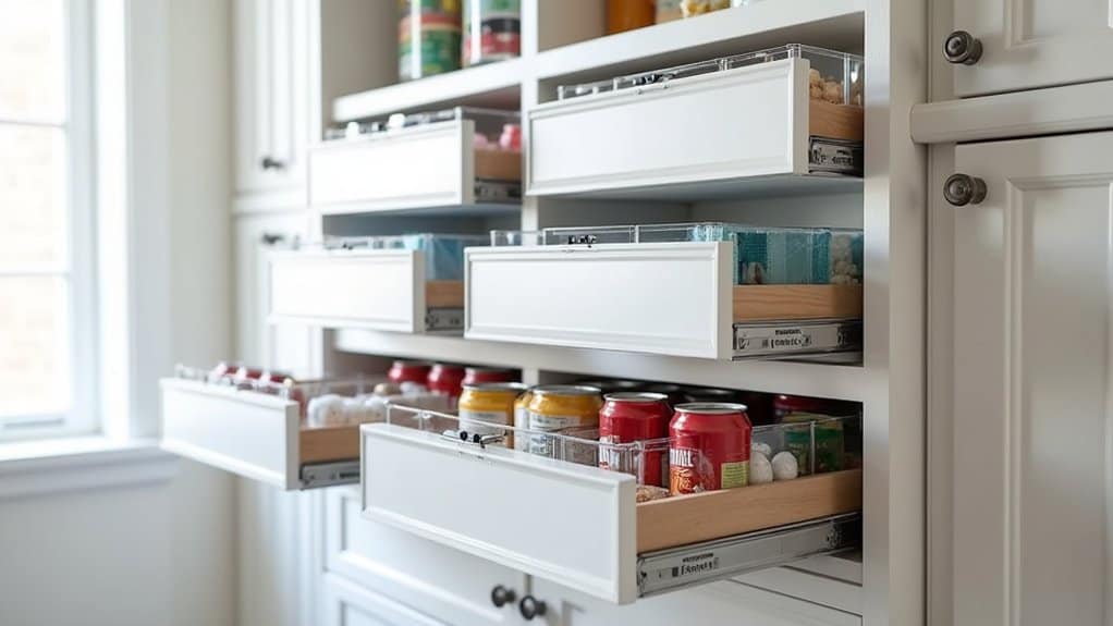 Pull-out drawers are a game-changer for pantry organization, maximizing space and making items easily accessible. Start by installing pull-out drawers or retrofit kits in your pantry cabinets, focusing on lower shelves where items often get lost in the back. Measure your cabinet dimensions to guarantee the drawers fit properly, and opt for models with full-extension glides for complete access to the entire drawer. Group similar items together in each drawer, such as canned goods, snacks, or baking supplies, to create a logical system.