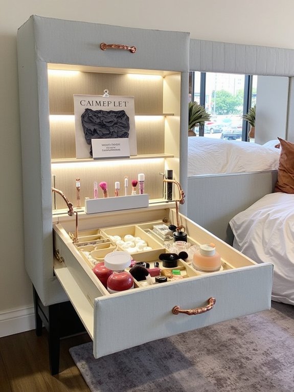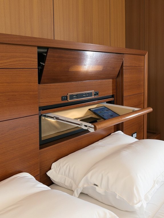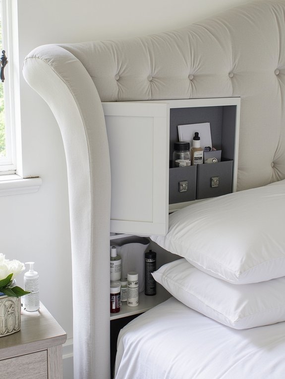 A pull-down makeup storage compartment transforms your headboard into an organized vanity area, offering a space-saving solution for cosmetics and beauty products. This clever addition creates a compact organization system that keeps your daily essentials within easy reach while maintaining a clutter-free bedroom environment.