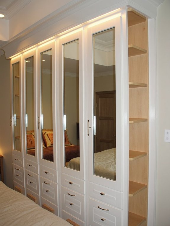 A built-in storage mirror system combines functionality with space efficiency by integrating a full-length mirror into custom cabinetry. The design features a 72″ x 24″ mirror mounted on concealed hinges, which opens to reveal adjustable shelving for storing accessories and jewelry. LED strip lighting around the frame provides enhanced visibility.