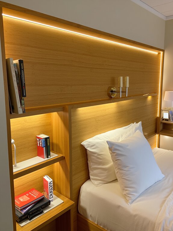 A bedside reading light shelf combines illumination and storage in one sleek headboard solution. By incorporating LED strips into a floating shelf design, it provides both ambient lighting for reading and a convenient spot to keep books within reach.