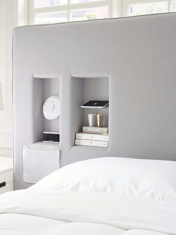 Transform your headboard into a charging station by creating three strategic hidden compartments. Install wireless charging pads behind thin wood panels for phones and tablets, while concealing all cables through the back panel. Each section serves a specific purpose, with the top cubby fitting larger devices, the middle section housing wireless chargers, and the lower area containing power management systems.