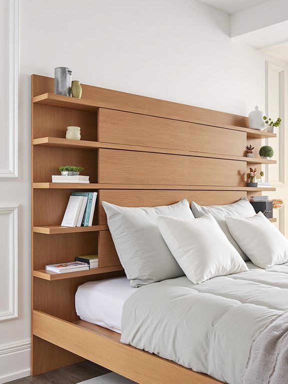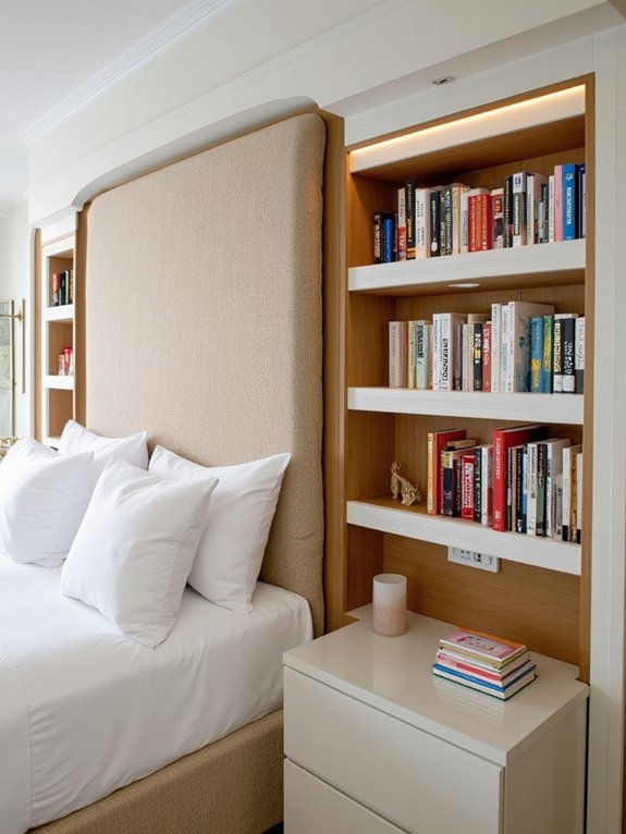 Transform your headboard into a secret reading sanctuary with three hidden compartments that keep books within easy reach while maintaining a clutter-free bedroom. These cleverly concealed spaces feature sliding panels, soft-close mechanisms, and built-in lighting.