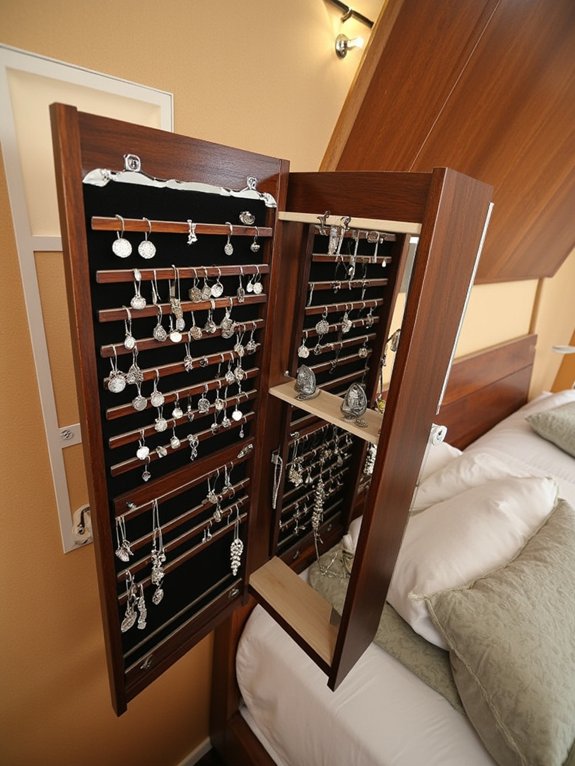 A pull-out jewelry organizer integrated into headboard storage offers a space-saving way to keep jewelry organized and accessible. The sliding compartment features velvet-lined sections for rings and earrings, plus dedicated hooks for necklaces, all protected behind a mirrored door.