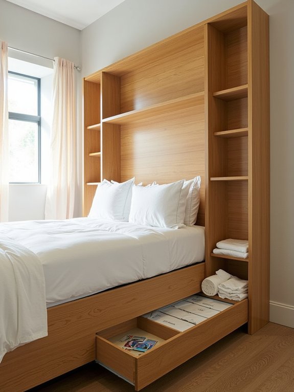 Hidden under-bed drawers provide a smart storage solution that utilizes otherwise wasted space beneath the bed. When paired with a storage headboard, this system creates comprehensive bedroom organization while maintaining a clean, uncluttered appearance.