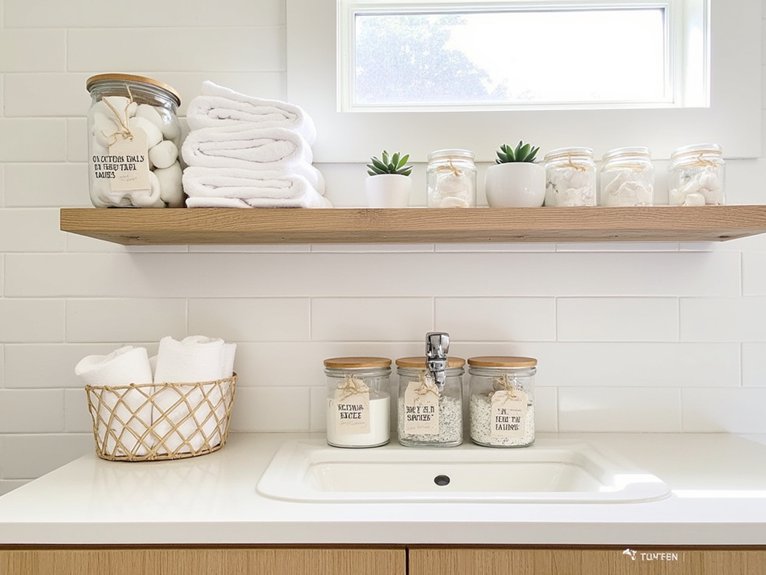 Transforming a bathroom into an organized space is achievable with simple DIY hacks. Start with custom labels for baskets, measuring 3×5 inches, to identify toiletries instantly. As expert organizer Jane Smith advises, “Labeling cuts search time by 50%, streamlining mornings.” These 12 ideas, from rustic shelves to vintage trunks, offer practical solutions. Curious about crafting a shelf in under two hours? Stick around for step-by-step guidance on maximizing every corner.