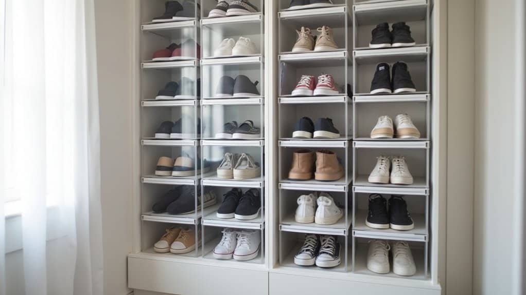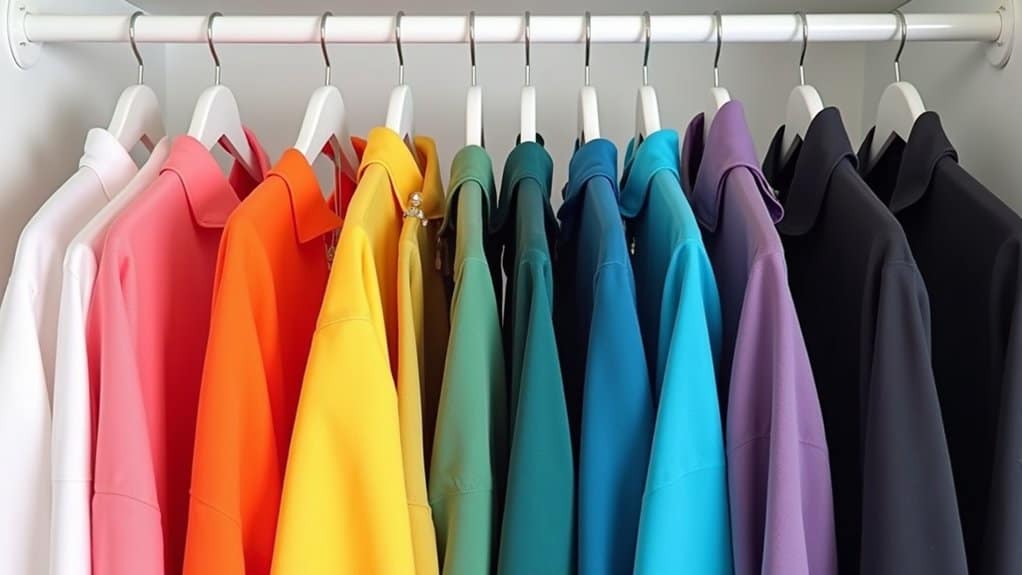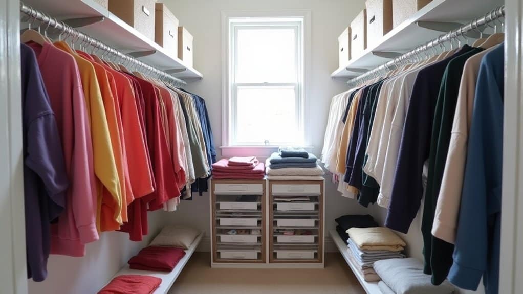 Another effective method is to utilize vertical space with stackable bins or shelves for items like scarves, hats, or folded sweaters, maximizing storage in tight spaces. Incorporate multi-tiered hangers for pants or skirts to save room on the closet rod while keeping garments accessible. Additionally, label bins or sections with tags to maintain order and guarantee everything returns to its designated spot after use.