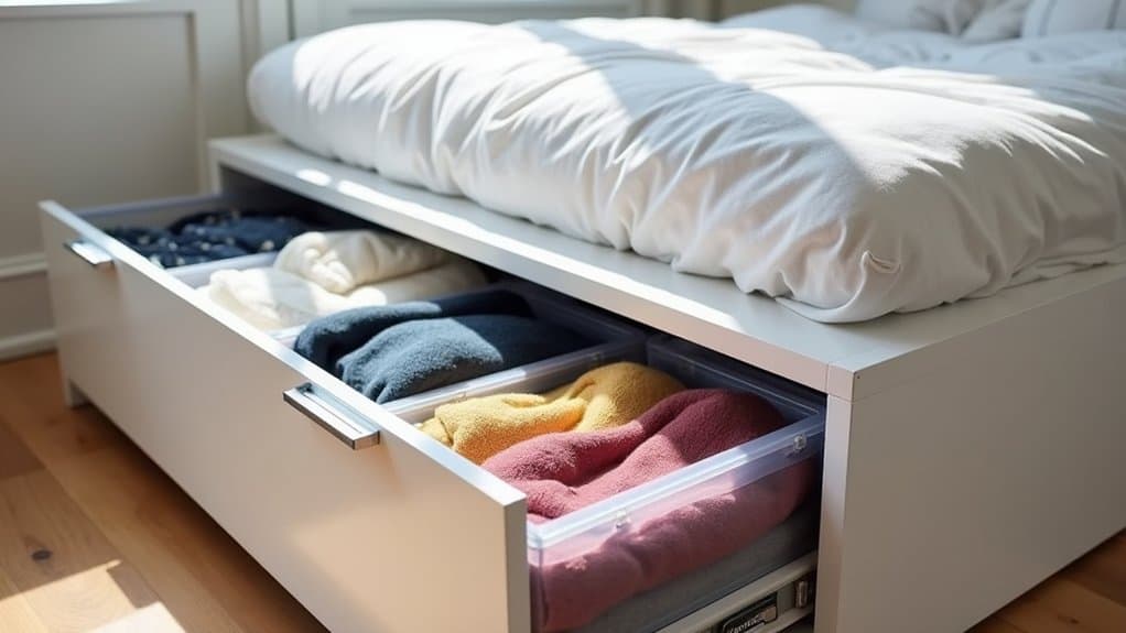 To organize effectively, categorize items before storing them under the bed, grouping similar things like winter sweaters or spare bedding together. Label each container for quick identification, and consider using vacuum-sealed bags for bulkier items to save even more space. This method not only declutters your wardrobe area but also keeps lesser-used items out of sight yet readily accessible when needed.