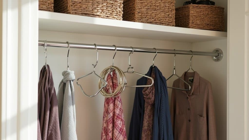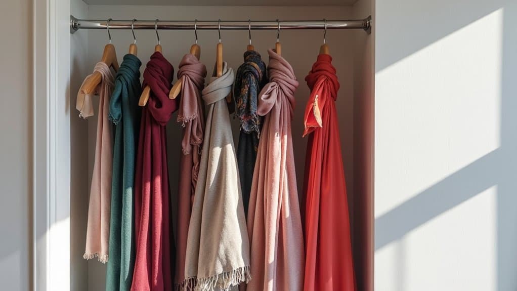 For a more creative approach, install a small tension rod or towel rack inside your closet door to hang scarves individually. This method not only saves space but also lets you see all your scarves at a glance for quick selection. If you’re short on closet space, consider using over-the-door hooks or a wall-mounted rack to create a stylish display while keeping them organized.