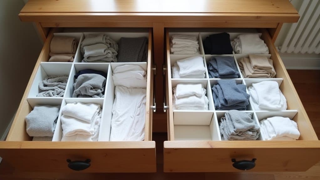 Drawer dividers are an excellent tool for maintaining order within your wardrobe drawers, helping to categorize clothing items efficiently. Start by evaluating the contents of your drawer—group similar items like socks, underwear, or accessories together. Then, measure the drawer’s dimensions to select or create dividers that fit snugly, ensuring no space is wasted.