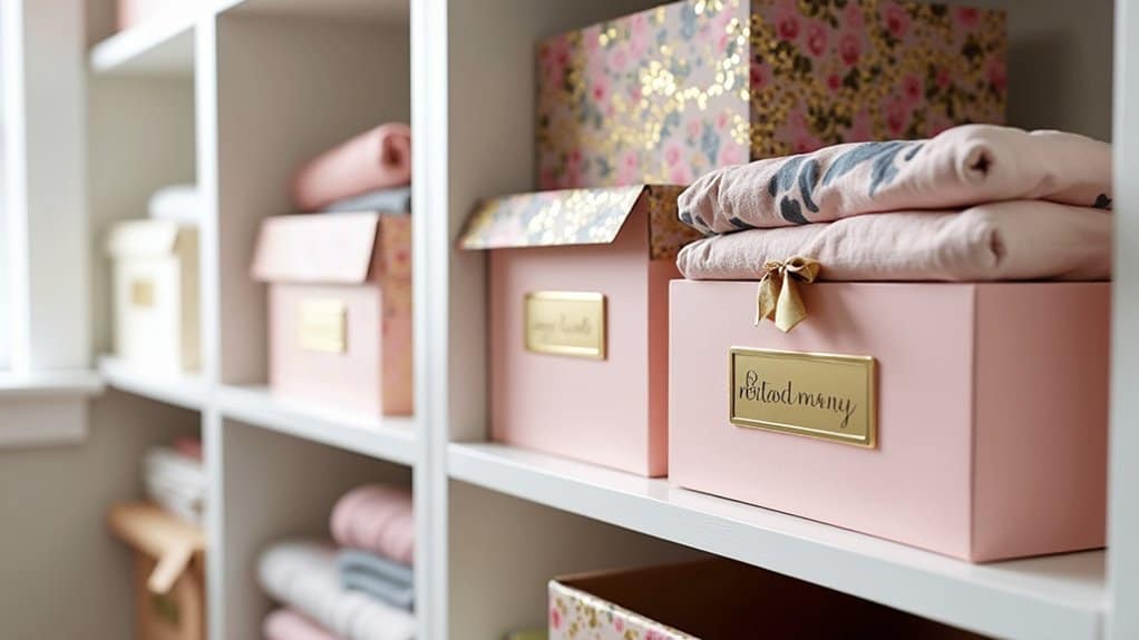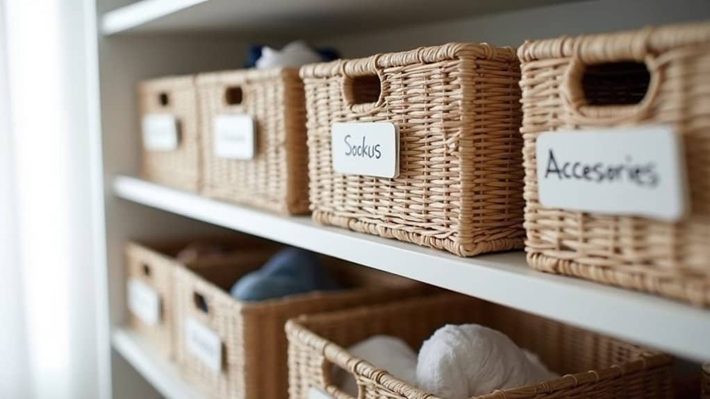 To guarantee long-term organization, place the labeled baskets in accessible locations on shelves or inside your wardrobe. Regularly review the contents to keep items in their designated spots and update labels if you rearrange categories. This small effort prevents clutter and saves time when searching for specific pieces.
