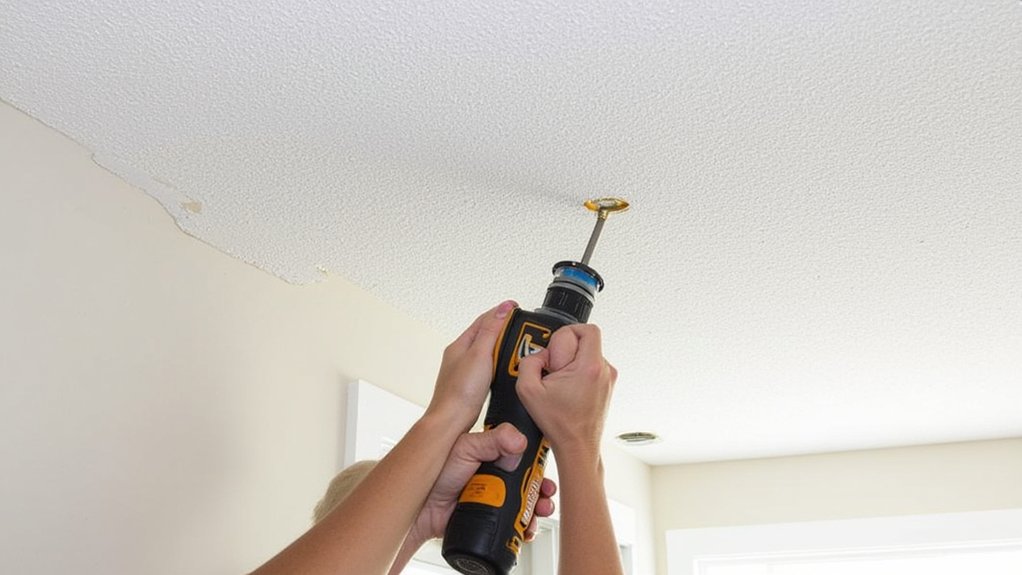 Following proper safety protocols, you’ll need specific techniques for mounting heavier items to your ceiling. For items over 10 pounds, follow these essential steps: