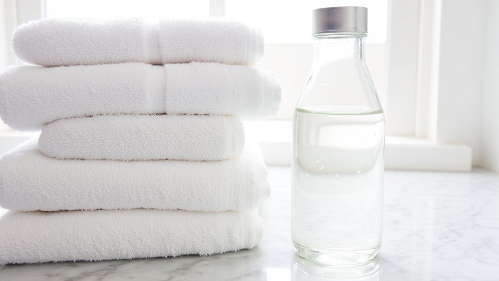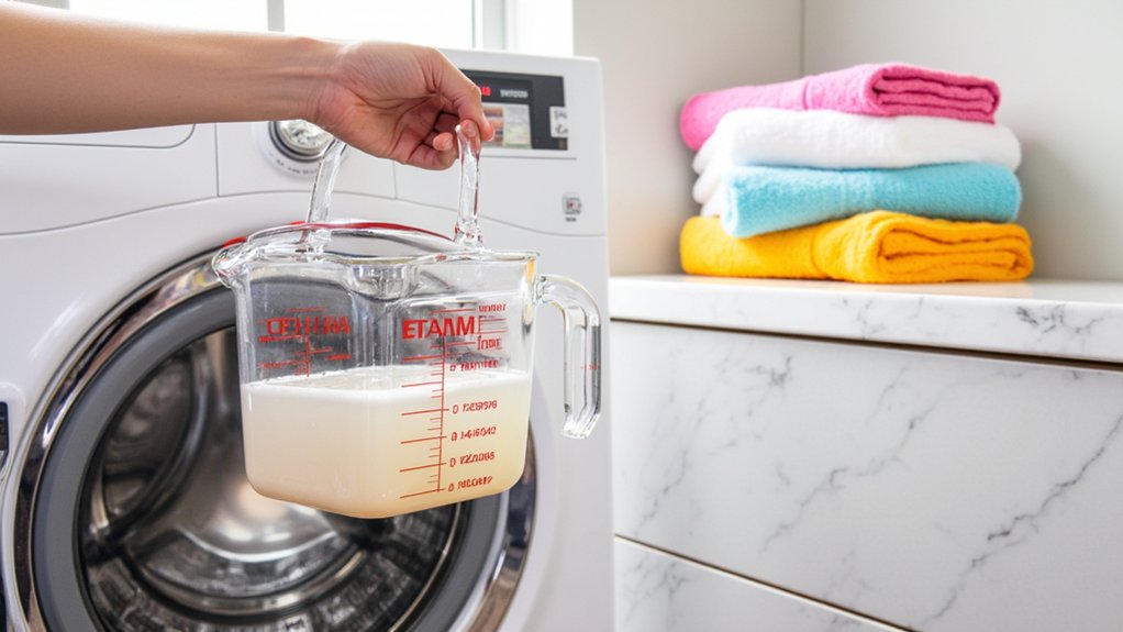 When you add white vinegar to your laundry, its acetic acid works to break down mineral deposits and residual detergent that can make fabrics feel stiff. The basic fabric chemistry at work involves vinegar’s ability to dissolve these stubborn buildups while balancing the pH levels in your clothes.