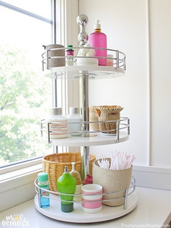 This simple storage solution provides 360-degree access to bathroom essentials like toiletries, makeup, and hair products while maximizing counter space. The spinning mechanism keeps items organized and easily accessible, making it an affordable alternative to store-bought lazy Susans.