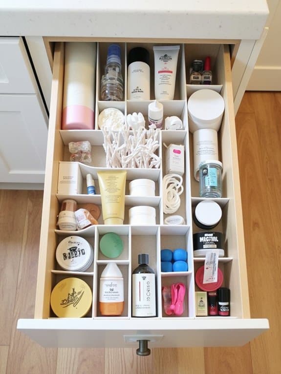 The key is to use small containers to separate different categories of items, position frequently used products at the front, and clearly label each section. Adding drawer liner underneath prevents dividers from shifting while making maintenance easier. This system ensures everything stays organized and accessible for the long term.