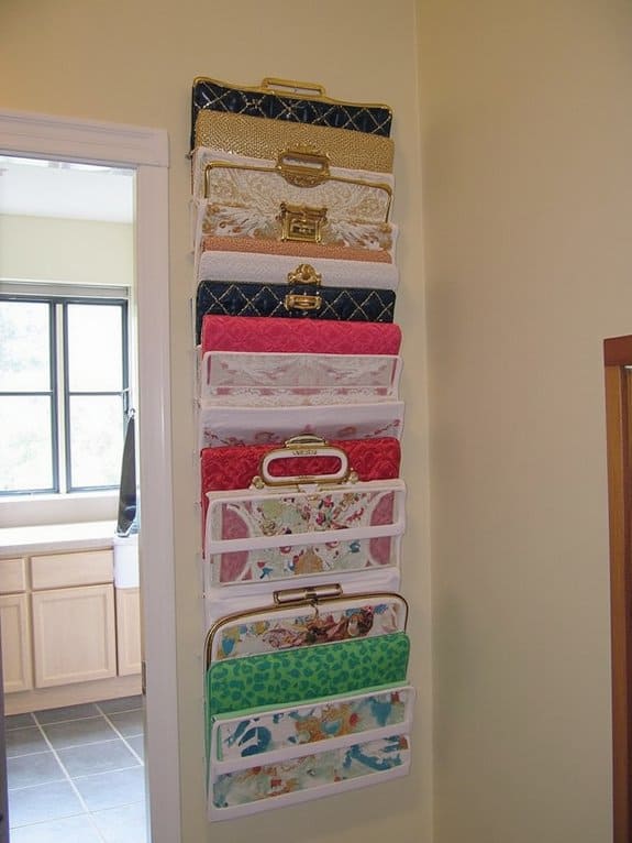 Magazine holders provide an innovative storage solution for organizing clutch purses and small handbags. These affordable containers, typically found at dollar stores, keep clutches organized, visible, and protected while maximizing vertical closet space.