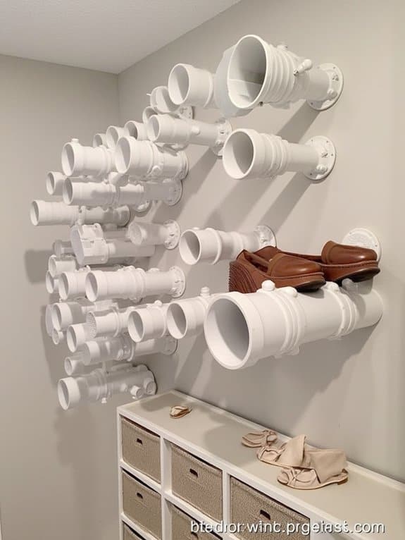 Transform your closet organization with custom PVC pipe shoe storage. Cut 6-inch diameter PVC pipes into 12-inch lengths to create individual compartments that fit most adult shoes. Stack and secure the pipes using industrial adhesive or mounting brackets to build a modular storage system.
