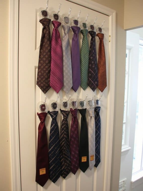 For optimal organization, install hooks in straight or staggered patterns and limit each hook to 2-3 ties. The clear or white hooks maintain a clean aesthetic, while their adhesive backing allows for easy installation and removal without damaging walls – making them particularly suitable for renters seeking temporary storage options.