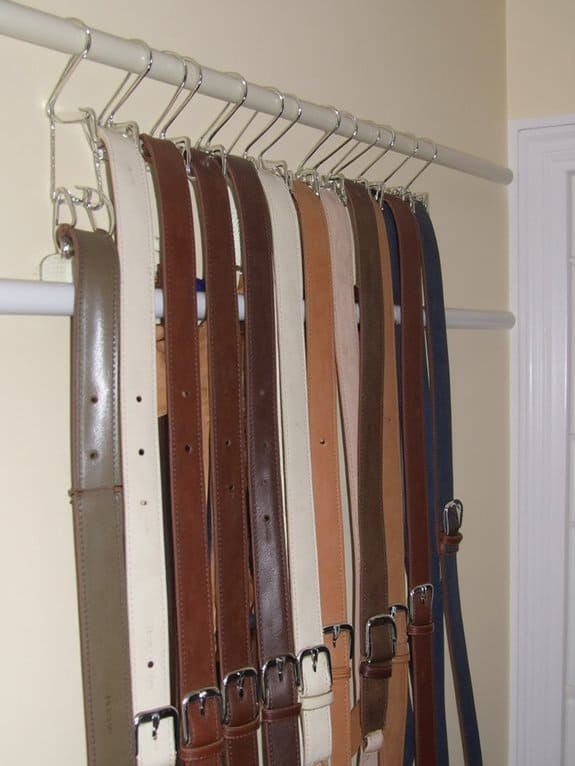 S-hooks offer a practical solution for belt storage, eliminating the common problem of tangled belts in drawers. By hanging belts vertically on coated S-hooks, you can organize them efficiently while protecting the leather from damage.