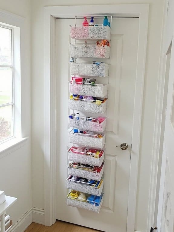 Over-door basket organizers offer convenient storage without permanent installation, utilizing vertical door space through a system of tiered wire baskets. The coated metal baskets can hold various items from towels to small accessories while keeping everything visible and accessible.