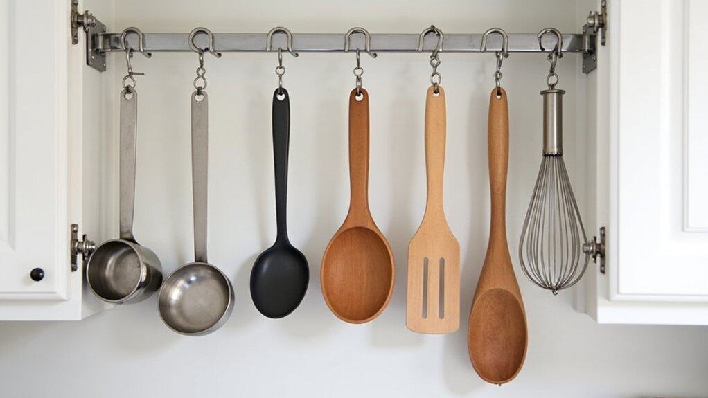 To maximize efficiency, consider using S-hooks or customizable hook racks that allow you to adjust spacing based on the size of your utensils. Hang measuring cups and spoons on smaller hooks near baking ingredients for convenience during meal prep. If space is limited, opt for a tension rod with detachable hooks to create a temporary hanging area inside a cabinet. Regularly assess your setup to remove unused or duplicate tools, guaranteeing the hooks remain functional and uncluttered over time.