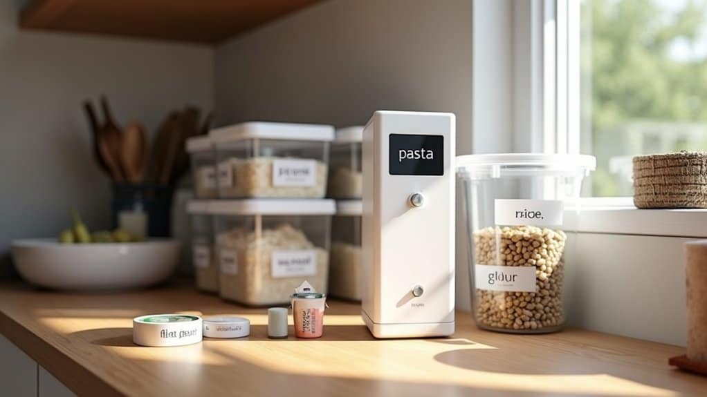 When choosing a label maker, consider models with Bluetooth connectivity for added convenience, allowing you to design labels directly from your smartphone. Check for bundles that include extra label tapes to avoid running out mid-project, as these often come at a better value. Websites like Amazon, Walmart, and Target often have competitive pricing, and subscribing to newsletters can alert you to flash sales or exclusive coupon codes. Comparing reviews and ratings can also help guarantee you’re getting a reliable device that fits your pantry labeling needs.