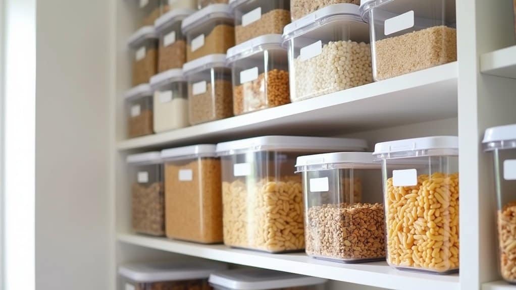 Utilizing clear jars for storing dry goods is a game-changer in pantry organization, offering both functionality and aesthetic appeal. Start by selecting a variety of airtight clear glass or plastic jars in different sizes to accommodate items like grains, pasta, beans, and spices. Decant bulk items into these jars immediately after purchase to keep them fresh and protected from pests. Make certain to clean and thoroughly dry the jars before use to prevent moisture buildup, which can spoil food.