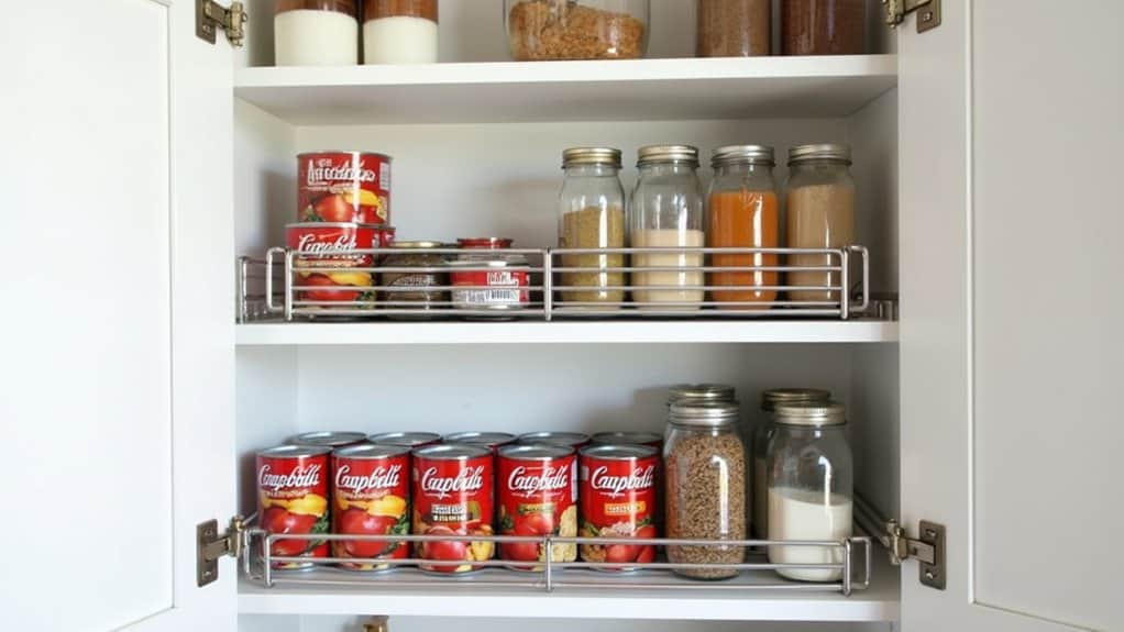 Over-the-door racks are a fantastic solution for maximizing storage space in your pantry, especially if you’re dealing with limited shelf room. These racks utilize the often-overlooked space on the back of pantry doors, making them perfect for storing a variety of items like spices, snacks, or canned goods. To start, measure the dimensions of your pantry door to guarantee the rack you choose fits properly without obstructing the door’s functionality. Install the rack according to the manufacturer’s instructions, typically using hooks or screws, and verify it’s securely mounted to handle the weight of your items.