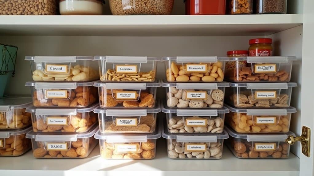 Beyond cost, consider durability and ease of cleaning when selecting bins to guarantee they withstand daily use. Clear bins allow for quick visibility of contents, while colored or opaque ones can hide clutter and create a uniform look if aesthetics matter to you. Utilize these bins to group similar items together, such as breakfast foods in one and spices in another, to save time during meal prep. With a small investment, these affordable solutions can keep your pantry tidy and functional without breaking the bank.