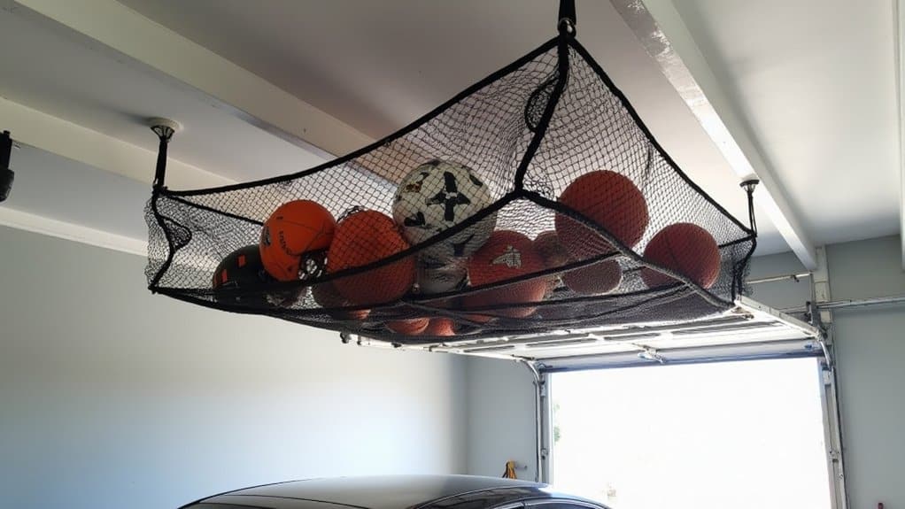 Ceiling net storage is an excellent solution for organizing sports gear, especially in garages or basements where floor space is limited. To begin, choose a sturdy net designed for overhead storage, guaranteeing it can handle the weight of your equipment, such as balls, helmets, and pads. Install the net securely using ceiling hooks or mounts, following the manufacturer’s instructions to ensure safety and stability.