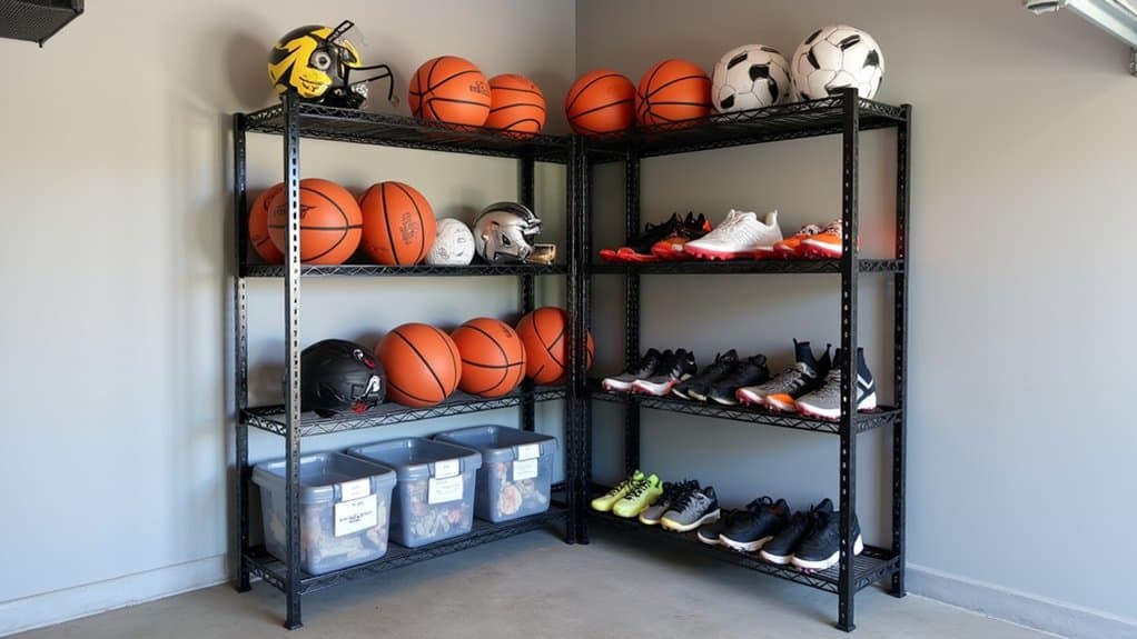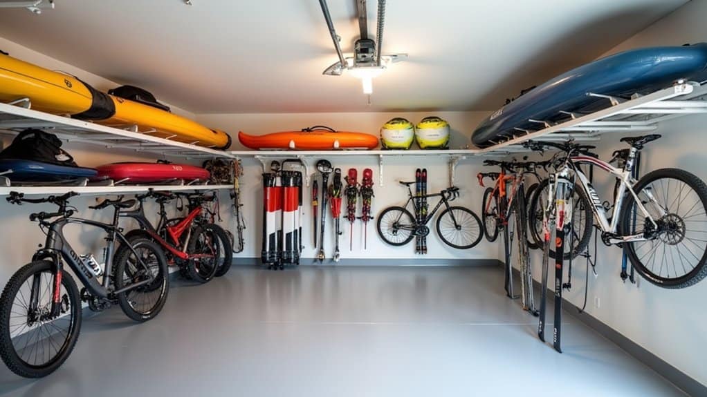 Overhead storage solutions are an excellent way to maximize space in a garage or shed for sports gear, keeping items off the floor and out of the way. Begin by installing sturdy overhead racks or shelves, guaranteeing they are securely anchored to ceiling joists or beams to handle the weight of heavy equipment like bikes, kayaks, or camping gear. Choose racks with adjustable heights or customizable configurations to accommodate various gear sizes and seasonal needs.