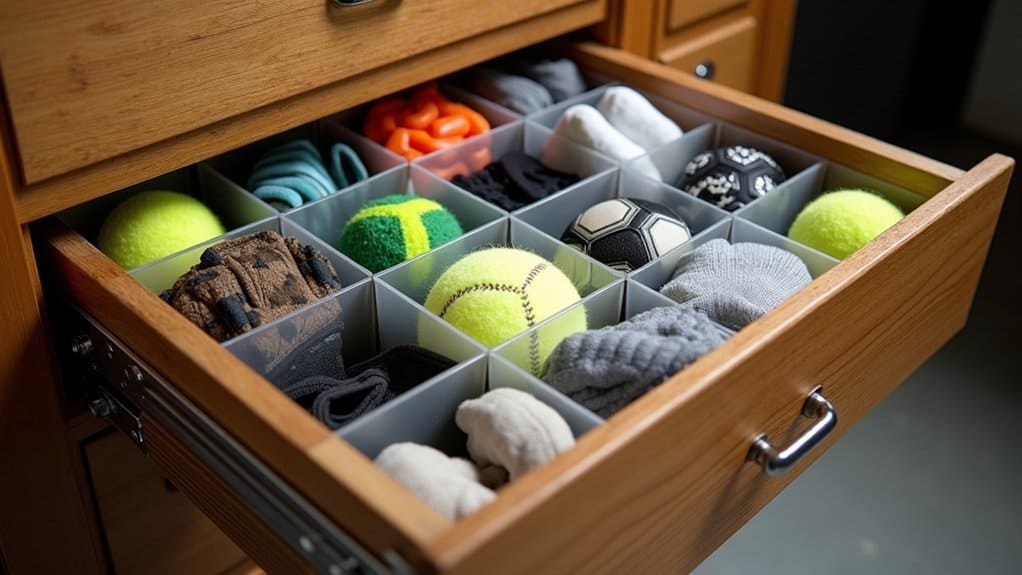 Next, use dividers or small containers within the sliding drawer to keep each category separate and easily visible. Label the sections if necessary to maintain order and make sure everyone in the household knows where items belong. Regularly tidy the drawer by removing unused gear or reallocating space as your sports needs evolve, making certain the system remains functional over time.