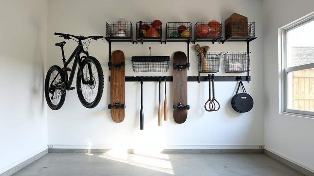 Once installed, categorize your sports gear and assign specific spots on the rack for each type of equipment to maintain order. For instance, hang bikes on designated hooks, place smaller items like gloves or balls in attached baskets, and store larger gear like snowboards vertically. Regularly check the rack for wear or loosening screws to guarantee safety and keep the setup clutter-free by returning items to their designated spots after use.